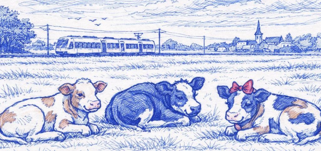 Les Vaches de Nort retournent à leurs occupations habituelles : brouter, ruminer, regarder passer le tram-train.